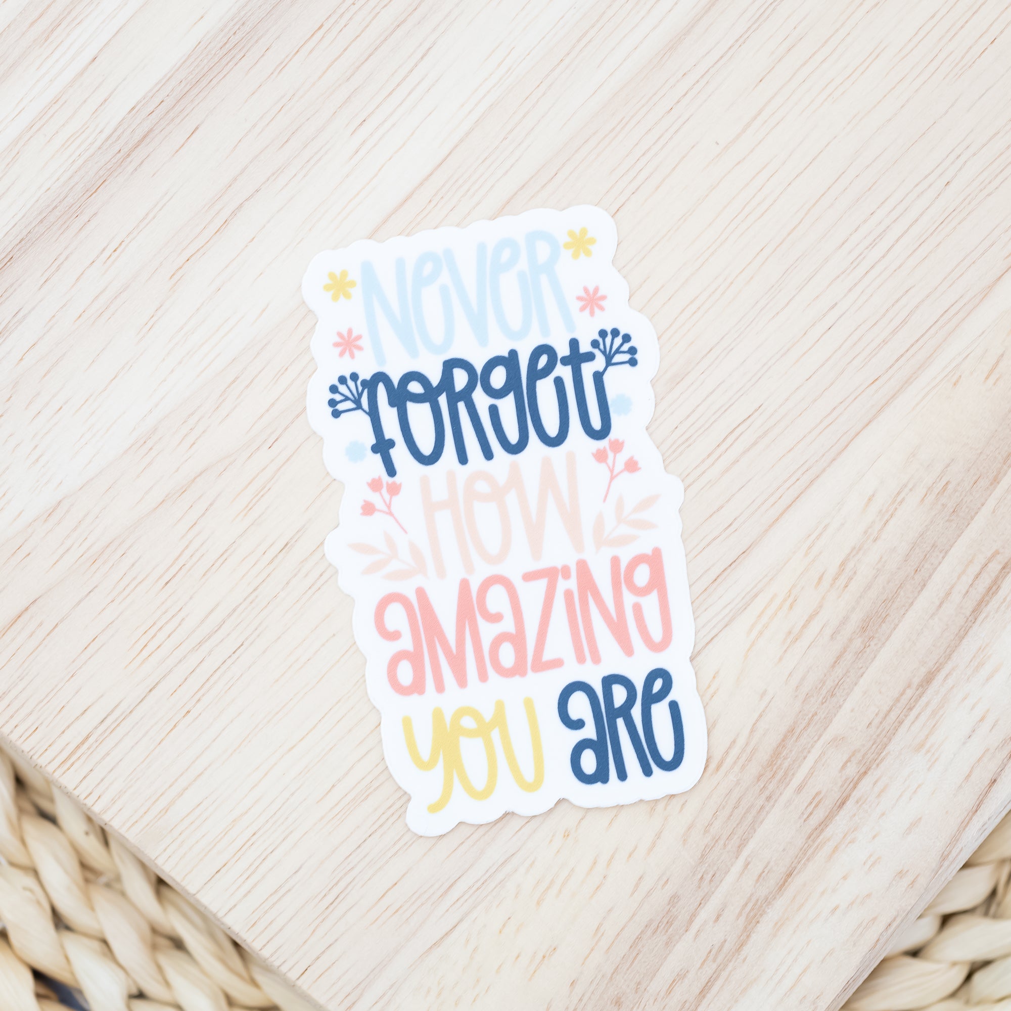 “Never Forget How Amazing You Are” isn’t just a phrase—it’s a reminder we all need. Life gets busy, and it’s easy to lose sight of your worth. This sticker is like a little nudge of encouragement you can carry with you every day.