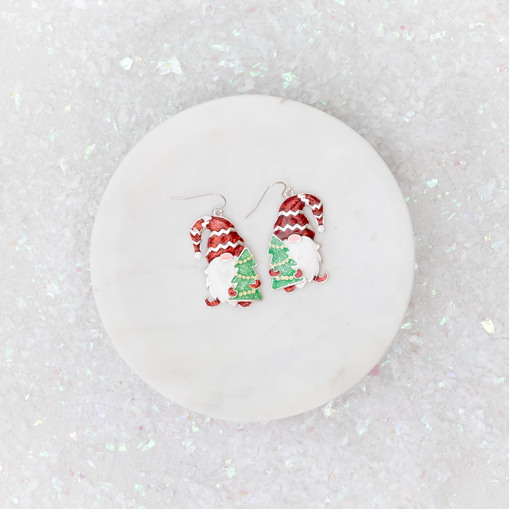 Christmas Gnome Earrings with Christmas Trees Silver-Tone