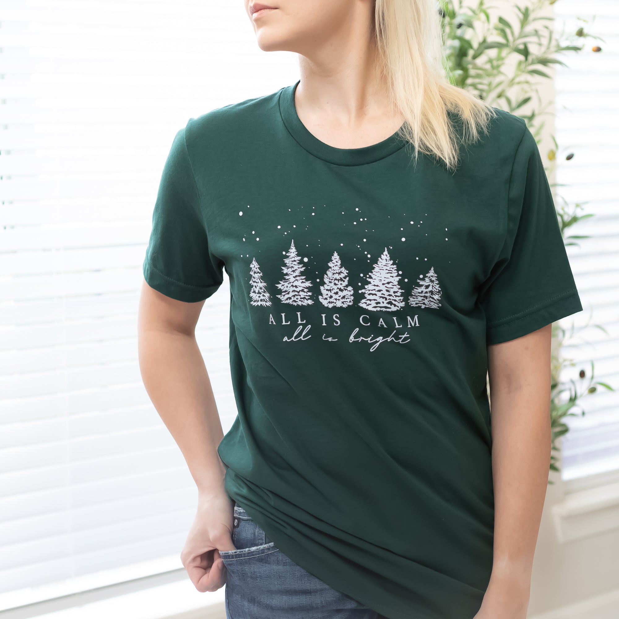 Stay cozy and festive with the All is Calm, All is Bright Christmas Trees Graphic Tee. Featuring a peaceful holiday design with rustic Christmas trees and faith-filled words, this soft, high-quality tee pairs perfectly with jeans, cardigans, or flannels. Made for comfort and style, it’s a beautiful reminder of the calm and light that Christmas brings. Perfect for everyday wear, family photos, or gifting this holiday season.