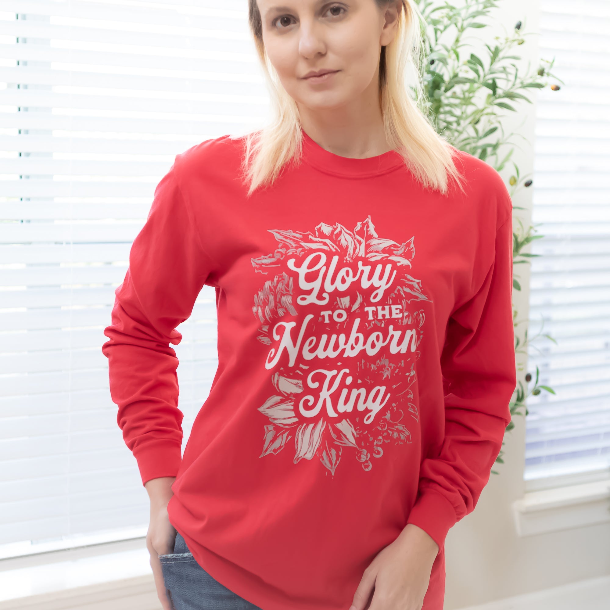 Honor the true reason for the season with the Glory to the Newborn King Scripted Long Sleeve Graphic Tee. Featuring elegant script lettering inspired by the beloved Christmas hymn, this soft, premium long sleeve tee blends comfort and faith in timeless style. Perfect for church events, family gatherings, or cozy winter days, it pairs beautifully with jeans, vests, or cardigans. A beautiful expression of worship and Christmas joy to wear all season long.