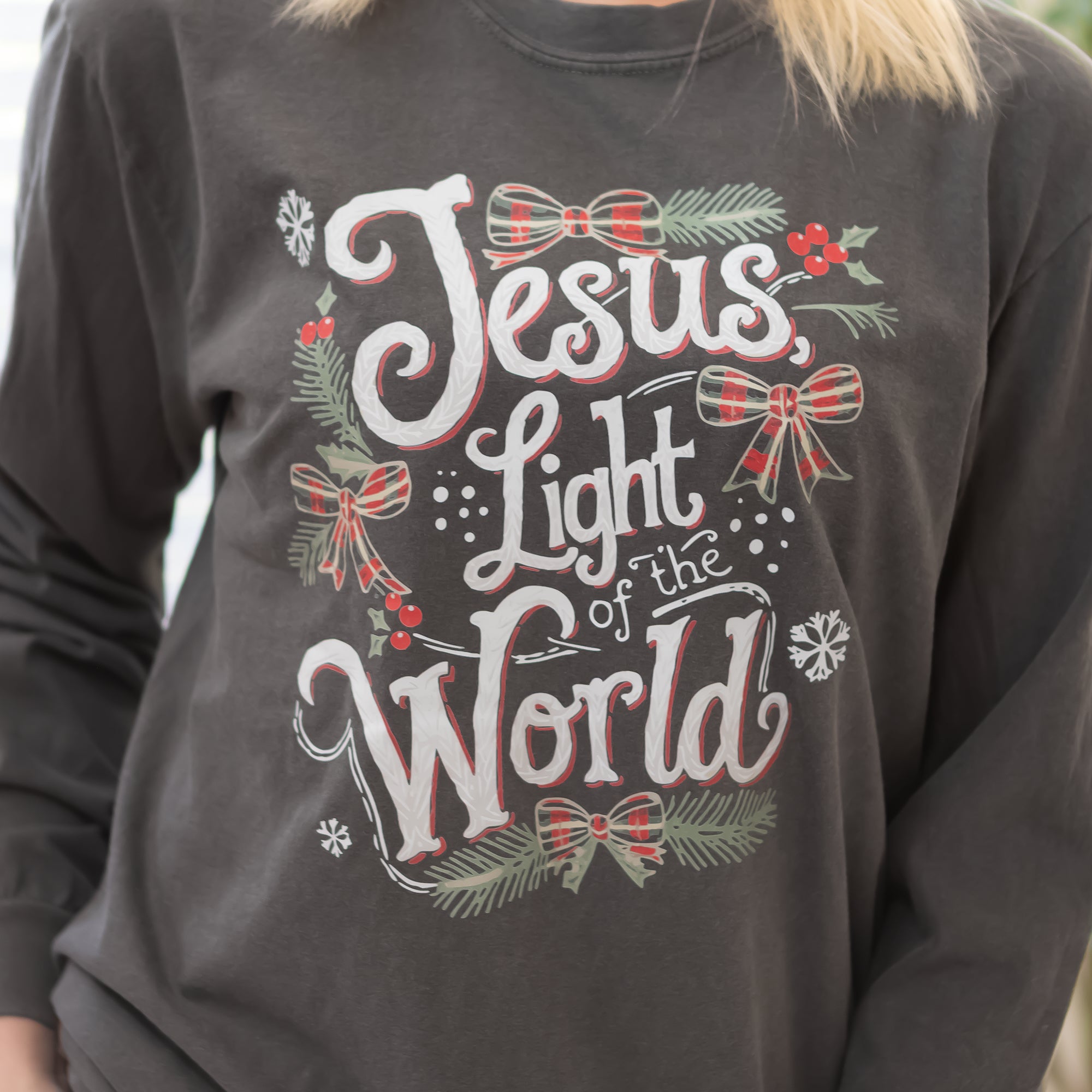 Shine His light this season with the Jesus Light of the World Long Sleeve Graphic Tee. Featuring elegant script lettering and a subtle, faith-centered design, this soft, premium long sleeve tee is a beautiful reminder of Christ’s hope and love. Perfect for layering with cozy flannels or wearing alone, it’s ideal for church gatherings, holiday events, or everyday wear. Comfortable, meaningful, and designed to share the true light of Christmas.